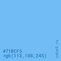 Цвет #71BCF5 в цветовой модели RGB обозначается тремя октетами (113, 188, 245) в десятичном формате и #71BCF5 в шестнадцатиричном (hex) формате, которые являются интенсивностью красного 113 (hex 71), интенсивность зелёного 188 (hex BC) и интенсивность синего 245 (hex F5).