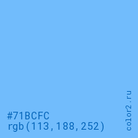 Цвет #71BCFC в цветовой модели RGB обозначается тремя октетами (113, 188, 252) в десятичном формате и #71BCFC в шестнадцатиричном (hex) формате, которые являются интенсивностью красного 113 (hex 71), интенсивность зелёного 188 (hex BC) и интенсивность синего 252 (hex FC).