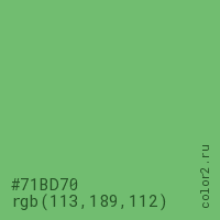 Цвет #71BD70 в цветовой модели RGB обозначается тремя октетами (113, 189, 112) в десятичном формате и #71BD70 в шестнадцатиричном (hex) формате, которые являются интенсивностью красного 113 (hex 71), интенсивность зелёного 189 (hex BD) и интенсивность синего 112 (hex 70).