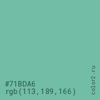 Цвет #71BDA6 в цветовой модели RGB обозначается тремя октетами (113, 189, 166) в десятичном формате и #71BDA6 в шестнадцатиричном (hex) формате, которые являются интенсивностью красного 113 (hex 71), интенсивность зелёного 189 (hex BD) и интенсивность синего 166 (hex A6).
