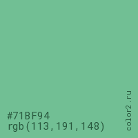 Цвет #71BF94 в цветовой модели RGB обозначается тремя октетами (113, 191, 148) в десятичном формате и #71BF94 в шестнадцатиричном (hex) формате, которые являются интенсивностью красного 113 (hex 71), интенсивность зелёного 191 (hex BF) и интенсивность синего 148 (hex 94).