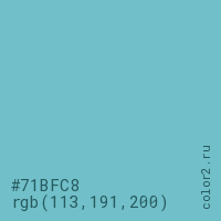 Цвет #71BFC8 в цветовой модели RGB обозначается тремя октетами (113, 191, 200) в десятичном формате и #71BFC8 в шестнадцатиричном (hex) формате, которые являются интенсивностью красного 113 (hex 71), интенсивность зелёного 191 (hex BF) и интенсивность синего 200 (hex C8).