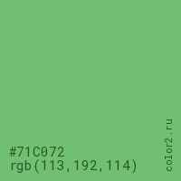 Цвет #71C072 в цветовой модели RGB обозначается тремя октетами (113, 192, 114) в десятичном формате и #71C072 в шестнадцатиричном (hex) формате, которые являются интенсивностью красного 113 (hex 71), интенсивность зелёного 192 (hex C0) и интенсивность синего 114 (hex 72).