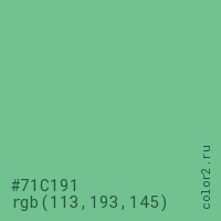 Цвет #71C191 в цветовой модели RGB обозначается тремя октетами (113, 193, 145) в десятичном формате и #71C191 в шестнадцатиричном (hex) формате, которые являются интенсивностью красного 113 (hex 71), интенсивность зелёного 193 (hex C1) и интенсивность синего 145 (hex 91).