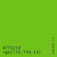 Цвет #71C218 в цветовой модели RGB обозначается тремя октетами (113, 194, 24) в десятичном формате и #71C218 в шестнадцатиричном (hex) формате, которые являются интенсивностью красного 113 (hex 71), интенсивность зелёного 194 (hex C2) и интенсивность синего 24 (hex 18).