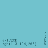 Цвет #71C2CD в цветовой модели RGB обозначается тремя октетами (113, 194, 205) в десятичном формате и #71C2CD в шестнадцатиричном (hex) формате, которые являются интенсивностью красного 113 (hex 71), интенсивность зелёного 194 (hex C2) и интенсивность синего 205 (hex CD).
