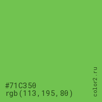 Цвет #71C350 в цветовой модели RGB обозначается тремя октетами (113, 195, 80) в десятичном формате и #71C350 в шестнадцатиричном (hex) формате, которые являются интенсивностью красного 113 (hex 71), интенсивность зелёного 195 (hex C3) и интенсивность синего 80 (hex 50).