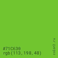 Цвет #71C630 в цветовой модели RGB обозначается тремя октетами (113, 198, 48) в десятичном формате и #71C630 в шестнадцатиричном (hex) формате, которые являются интенсивностью красного 113 (hex 71), интенсивность зелёного 198 (hex C6) и интенсивность синего 48 (hex 30).