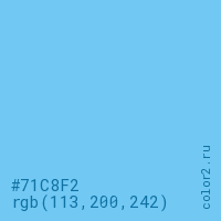 Цвет #71C8F2 в цветовой модели RGB обозначается тремя октетами (113, 200, 242) в десятичном формате и #71C8F2 в шестнадцатиричном (hex) формате, которые являются интенсивностью красного 113 (hex 71), интенсивность зелёного 200 (hex C8) и интенсивность синего 242 (hex F2).