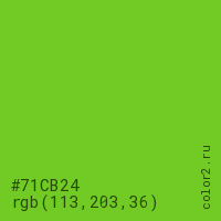 Цвет #71CB24 в цветовой модели RGB обозначается тремя октетами (113, 203, 36) в десятичном формате и #71CB24 в шестнадцатиричном (hex) формате, которые являются интенсивностью красного 113 (hex 71), интенсивность зелёного 203 (hex CB) и интенсивность синего 36 (hex 24).