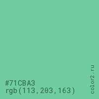 Цвет #71CBA3 в цветовой модели RGB обозначается тремя октетами (113, 203, 163) в десятичном формате и #71CBA3 в шестнадцатиричном (hex) формате, которые являются интенсивностью красного 113 (hex 71), интенсивность зелёного 203 (hex CB) и интенсивность синего 163 (hex A3).