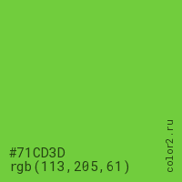 Цвет #71CD3D в цветовой модели RGB обозначается тремя октетами (113, 205, 61) в десятичном формате и #71CD3D в шестнадцатиричном (hex) формате, которые являются интенсивностью красного 113 (hex 71), интенсивность зелёного 205 (hex CD) и интенсивность синего 61 (hex 3D).