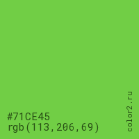 Цвет #71CE45 в цветовой модели RGB обозначается тремя октетами (113, 206, 69) в десятичном формате и #71CE45 в шестнадцатиричном (hex) формате, которые являются интенсивностью красного 113 (hex 71), интенсивность зелёного 206 (hex CE) и интенсивность синего 69 (hex 45).