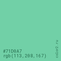 Цвет #71D0A7 в цветовой модели RGB обозначается тремя октетами (113, 208, 167) в десятичном формате и #71D0A7 в шестнадцатиричном (hex) формате, которые являются интенсивностью красного 113 (hex 71), интенсивность зелёного 208 (hex D0) и интенсивность синего 167 (hex A7).