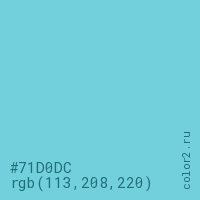 Цвет #71D0DC в цветовой модели RGB обозначается тремя октетами (113, 208, 220) в десятичном формате и #71D0DC в шестнадцатиричном (hex) формате, которые являются интенсивностью красного 113 (hex 71), интенсивность зелёного 208 (hex D0) и интенсивность синего 220 (hex DC).