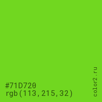 Цвет #71D720 в цветовой модели RGB обозначается тремя октетами (113, 215, 32) в десятичном формате и #71D720 в шестнадцатиричном (hex) формате, которые являются интенсивностью красного 113 (hex 71), интенсивность зелёного 215 (hex D7) и интенсивность синего 32 (hex 20).