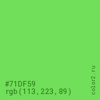 Цвет #71DF59 в цветовой модели RGB обозначается тремя октетами (113, 223, 89) в десятичном формате и #71DF59 в шестнадцатиричном (hex) формате, которые являются интенсивностью красного 113 (hex 71), интенсивность зелёного 223 (hex DF) и интенсивность синего 89 (hex 59).