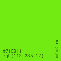 Цвет #71EB11 в цветовой модели RGB обозначается тремя октетами (113, 235, 17) в десятичном формате и #71EB11 в шестнадцатиричном (hex) формате, которые являются интенсивностью красного 113 (hex 71), интенсивность зелёного 235 (hex EB) и интенсивность синего 17 (hex 11).