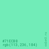 Цвет #71ECB8 в цветовой модели RGB обозначается тремя октетами (113, 236, 184) в десятичном формате и #71ECB8 в шестнадцатиричном (hex) формате, которые являются интенсивностью красного 113 (hex 71), интенсивность зелёного 236 (hex EC) и интенсивность синего 184 (hex B8).