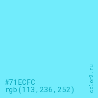 Цвет #71ECFC в цветовой модели RGB обозначается тремя октетами (113, 236, 252) в десятичном формате и #71ECFC в шестнадцатиричном (hex) формате, которые являются интенсивностью красного 113 (hex 71), интенсивность зелёного 236 (hex EC) и интенсивность синего 252 (hex FC).