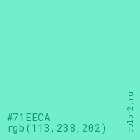 Цвет #71EECA в цветовой модели RGB обозначается тремя октетами (113, 238, 202) в десятичном формате и #71EECA в шестнадцатиричном (hex) формате, которые являются интенсивностью красного 113 (hex 71), интенсивность зелёного 238 (hex EE) и интенсивность синего 202 (hex CA).
