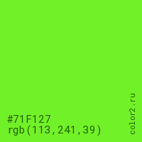 Цвет #71F127 в цветовой модели RGB обозначается тремя октетами (113, 241, 39) в десятичном формате и #71F127 в шестнадцатиричном (hex) формате, которые являются интенсивностью красного 113 (hex 71), интенсивность зелёного 241 (hex F1) и интенсивность синего 39 (hex 27).