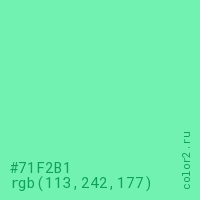 Цвет #71F2B1 в цветовой модели RGB обозначается тремя октетами (113, 242, 177) в десятичном формате и #71F2B1 в шестнадцатиричном (hex) формате, которые являются интенсивностью красного 113 (hex 71), интенсивность зелёного 242 (hex F2) и интенсивность синего 177 (hex B1).