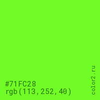 Цвет #71FC28 в цветовой модели RGB обозначается тремя октетами (113, 252, 40) в десятичном формате и #71FC28 в шестнадцатиричном (hex) формате, которые являются интенсивностью красного 113 (hex 71), интенсивность зелёного 252 (hex FC) и интенсивность синего 40 (hex 28).