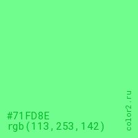 Цвет #71FD8E в цветовой модели RGB обозначается тремя октетами (113, 253, 142) в десятичном формате и #71FD8E в шестнадцатиричном (hex) формате, которые являются интенсивностью красного 113 (hex 71), интенсивность зелёного 253 (hex FD) и интенсивность синего 142 (hex 8E).