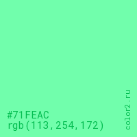 Цвет #71FEAC в цветовой модели RGB обозначается тремя октетами (113, 254, 172) в десятичном формате и #71FEAC в шестнадцатиричном (hex) формате, которые являются интенсивностью красного 113 (hex 71), интенсивность зелёного 254 (hex FE) и интенсивность синего 172 (hex AC).