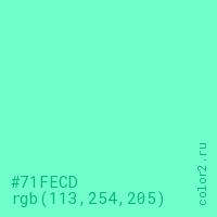 Цвет #71FECD в цветовой модели RGB обозначается тремя октетами (113, 254, 205) в десятичном формате и #71FECD в шестнадцатиричном (hex) формате, которые являются интенсивностью красного 113 (hex 71), интенсивность зелёного 254 (hex FE) и интенсивность синего 205 (hex CD).