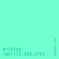 Цвет #71FFD2 в цветовой модели RGB обозначается тремя октетами (113, 255, 210) в десятичном формате и #71FFD2 в шестнадцатиричном (hex) формате, которые являются интенсивностью красного 113 (hex 71), интенсивность зелёного 255 (hex FF) и интенсивность синего 210 (hex D2).