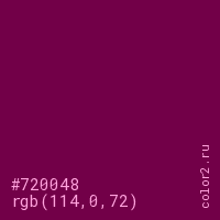 Цвет #720048 в цветовой модели RGB обозначается тремя октетами (114, 0, 72) в десятичном формате и #720048 в шестнадцатиричном (hex) формате, которые являются интенсивностью красного 114 (hex 72), интенсивность зелёного 0 (hex 00) и интенсивность синего 72 (hex 48).