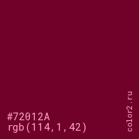 Цвет #72012A в цветовой модели RGB обозначается тремя октетами (114, 1, 42) в десятичном формате и #72012A в шестнадцатиричном (hex) формате, которые являются интенсивностью красного 114 (hex 72), интенсивность зелёного 1 (hex 01) и интенсивность синего 42 (hex 2A).