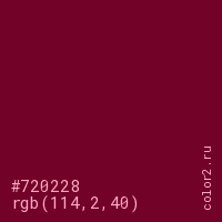 Цвет #720228 в цветовой модели RGB обозначается тремя октетами (114, 2, 40) в десятичном формате и #720228 в шестнадцатиричном (hex) формате, которые являются интенсивностью красного 114 (hex 72), интенсивность зелёного 2 (hex 02) и интенсивность синего 40 (hex 28).