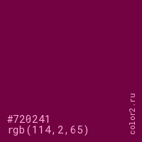Цвет #720241 в цветовой модели RGB обозначается тремя октетами (114, 2, 65) в десятичном формате и #720241 в шестнадцатиричном (hex) формате, которые являются интенсивностью красного 114 (hex 72), интенсивность зелёного 2 (hex 02) и интенсивность синего 65 (hex 41).