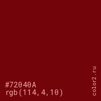 Цвет #72040A в цветовой модели RGB обозначается тремя октетами (114, 4, 10) в десятичном формате и #72040A в шестнадцатиричном (hex) формате, которые являются интенсивностью красного 114 (hex 72), интенсивность зелёного 4 (hex 04) и интенсивность синего 10 (hex 0A).