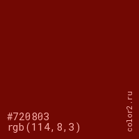 Цвет #720803 в цветовой модели RGB обозначается тремя октетами (114, 8, 3) в десятичном формате и #720803 в шестнадцатиричном (hex) формате, которые являются интенсивностью красного 114 (hex 72), интенсивность зелёного 8 (hex 08) и интенсивность синего 3 (hex 03).