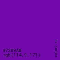 Цвет #7209AB в цветовой модели RGB обозначается тремя октетами (114, 9, 171) в десятичном формате и #7209AB в шестнадцатиричном (hex) формате, которые являются интенсивностью красного 114 (hex 72), интенсивность зелёного 9 (hex 09) и интенсивность синего 171 (hex AB).