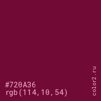 Цвет #720A36 в цветовой модели RGB обозначается тремя октетами (114, 10, 54) в десятичном формате и #720A36 в шестнадцатиричном (hex) формате, которые являются интенсивностью красного 114 (hex 72), интенсивность зелёного 10 (hex 0A) и интенсивность синего 54 (hex 36).