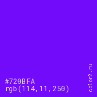 Цвет #720BFA в цветовой модели RGB обозначается тремя октетами (114, 11, 250) в десятичном формате и #720BFA в шестнадцатиричном (hex) формате, которые являются интенсивностью красного 114 (hex 72), интенсивность зелёного 11 (hex 0B) и интенсивность синего 250 (hex FA).