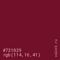 Цвет #721029 в цветовой модели RGB обозначается тремя октетами (114, 16, 41) в десятичном формате и #721029 в шестнадцатиричном (hex) формате, которые являются интенсивностью красного 114 (hex 72), интенсивность зелёного 16 (hex 10) и интенсивность синего 41 (hex 29).