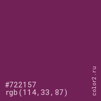 Цвет #722157 в цветовой модели RGB обозначается тремя октетами (114, 33, 87) в десятичном формате и #722157 в шестнадцатиричном (hex) формате, которые являются интенсивностью красного 114 (hex 72), интенсивность зелёного 33 (hex 21) и интенсивность синего 87 (hex 57).
