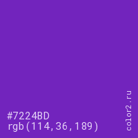 Цвет #7224BD в цветовой модели RGB обозначается тремя октетами (114, 36, 189) в десятичном формате и #7224BD в шестнадцатиричном (hex) формате, которые являются интенсивностью красного 114 (hex 72), интенсивность зелёного 36 (hex 24) и интенсивность синего 189 (hex BD).