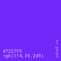 Цвет #7227F9 в цветовой модели RGB обозначается тремя октетами (114, 39, 249) в десятичном формате и #7227F9 в шестнадцатиричном (hex) формате, которые являются интенсивностью красного 114 (hex 72), интенсивность зелёного 39 (hex 27) и интенсивность синего 249 (hex F9).