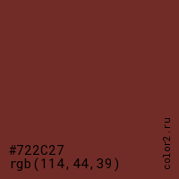 Цвет #722C27 в цветовой модели RGB обозначается тремя октетами (114, 44, 39) в десятичном формате и #722C27 в шестнадцатиричном (hex) формате, которые являются интенсивностью красного 114 (hex 72), интенсивность зелёного 44 (hex 2C) и интенсивность синего 39 (hex 27).
