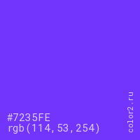Цвет #7235FE в цветовой модели RGB обозначается тремя октетами (114, 53, 254) в десятичном формате и #7235FE в шестнадцатиричном (hex) формате, которые являются интенсивностью красного 114 (hex 72), интенсивность зелёного 53 (hex 35) и интенсивность синего 254 (hex FE).