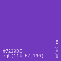 Цвет #7239BE в цветовой модели RGB обозначается тремя октетами (114, 57, 190) в десятичном формате и #7239BE в шестнадцатиричном (hex) формате, которые являются интенсивностью красного 114 (hex 72), интенсивность зелёного 57 (hex 39) и интенсивность синего 190 (hex BE).