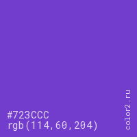 Цвет #723CCC в цветовой модели RGB обозначается тремя октетами (114, 60, 204) в десятичном формате и #723CCC в шестнадцатиричном (hex) формате, которые являются интенсивностью красного 114 (hex 72), интенсивность зелёного 60 (hex 3C) и интенсивность синего 204 (hex CC).