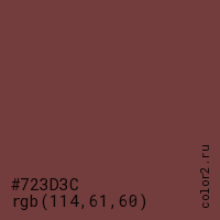 Цвет #723D3C в цветовой модели RGB обозначается тремя октетами (114, 61, 60) в десятичном формате и #723D3C в шестнадцатиричном (hex) формате, которые являются интенсивностью красного 114 (hex 72), интенсивность зелёного 61 (hex 3D) и интенсивность синего 60 (hex 3C).